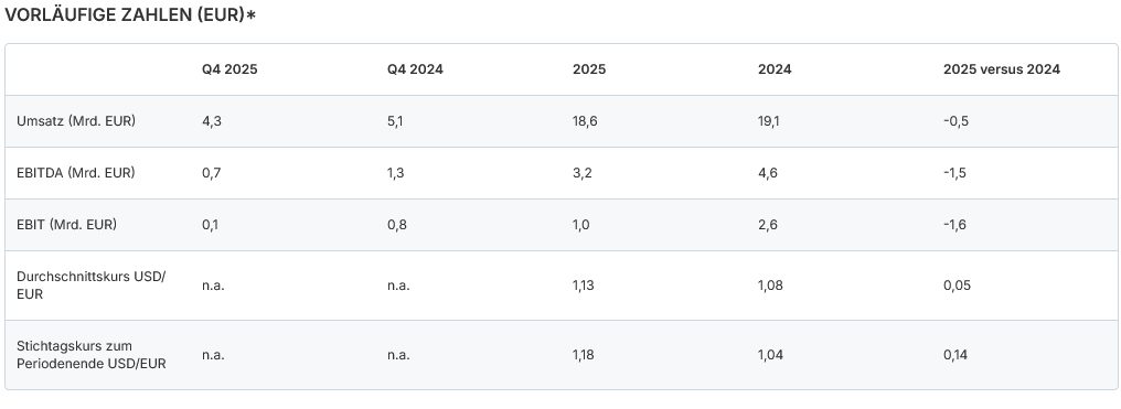 Hapag-Lloyd kommt im Geschäftsjahr 2025 laut vorläufigen Zahlen auf einen Konzernumsatz von 18,6 Milliarden Euro. Im Jahr zuvor waren es 19,1 Milliarden Euro. Das EBITDA ging auf 3,2 Milliarden Euro zurück (2024: 4,6 Milliarden Euro). Das EBIT fiel auf 1 Milliarde Euro (2024: 2,6 Milliarden Euro). Nach Angaben des Unternehmens liegt das Ergebnis damit am oberen Ende der Prognose. Es bleibt zugleich – wie erwartet – unter dem Vorjahresniveau.