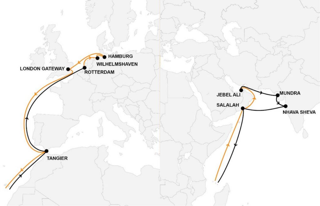 Wie Hapag-Lloyd auf seiner Website mitteilt, wird Deutschlands einziger Tiefwasserhafen nach Rotterdam der zweite europäische Hafen sein, den die Schiffe auf der Rotation anlaufen. Danach führt die Strecke über Hamburg, London und das marokkanische Tangier zurück nach Salalah (Oman), Jebel Ali (Vereinigte Arabische Emirate) und zu den indischen Häfen in Mundra und Nhava Sheva. Voraussichtlich am 24. Januar wird als erstes Schiff die „Los Angeles Express“ mit einer Kapazität von 13.500 TEU am Eurogate Container Terminal Wilhelmshaven erwartet.